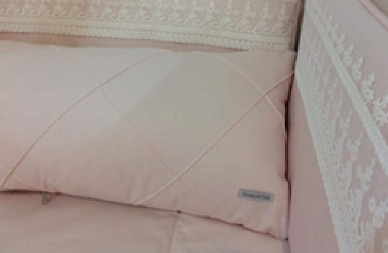 O Kit para berço é confeccionado em fustão em rosa ,tonalidade exclusiva Começo de Vida e detalhes em delicada renda em organza.